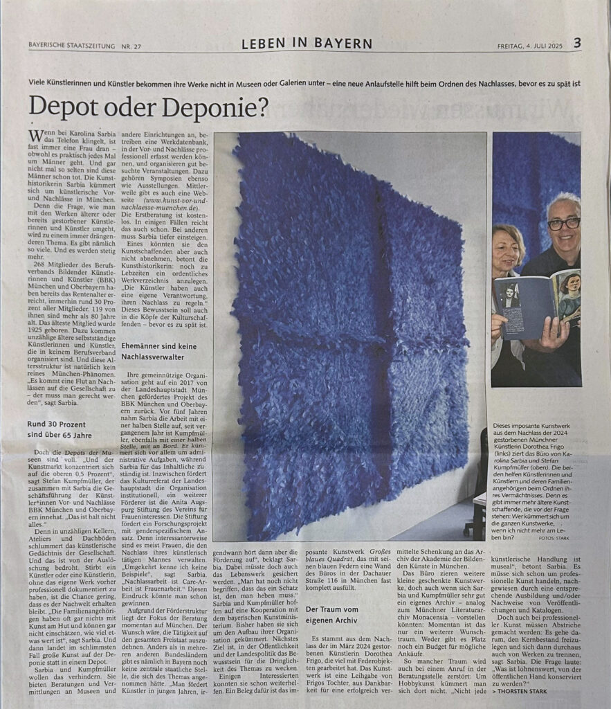 Im Juli 2025 erschien im Bayerischen Staatsanzeiger online und in der Printausgabe ein Artikel von Thorsten Stark über die Kunst Vor- und Nachlässe München.