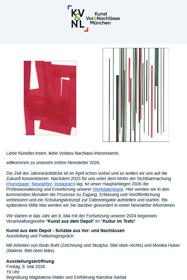 Wir versenden ca. vier mal jährlich einen Newsletter. In diesem Berichten wir über die Entwicklungen der Kunst Vor&Nachlässe München, informieren über anstehende und vergangene Veranstaltungen, Entwicklungen im Bereich Vorlass und Nachlass in der Bildenden Kunst und sonstiges aus unserem Fachgebiet.